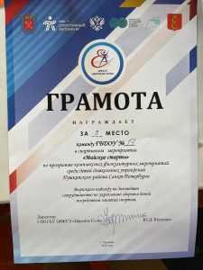 За 3 место в районных соревнованиях «Майские старты» среди команд ДОУ Пушкинского района Санкт-Петербурга.👏🥉